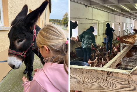 Mit viel Neugier und Begeisterung haben wir einen gemütlichen Spaziergang mit den Eseln gemacht und diese geputzt, Hühner gefüttert und frische Eier eingesammelt sowie Katzen, Ziegen und Schafe gestreichelt und gefüttert.